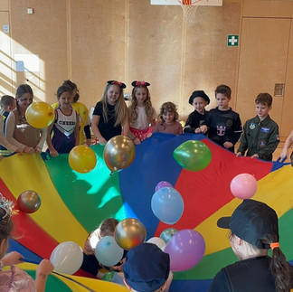 Mit Musik und viel guter Laune wurde getanzt, gelacht und gefeiert. Bunte Luftballons flogen durch den Raum und mit dem Schwungtuch hatten wir besonders viel SpaĂ. NatĂŒrlich durften auch lustige Spiele nicht fehlen und beim Verstecken im ganzen SchulgebĂ€ude wurde es richtig aufregend.
